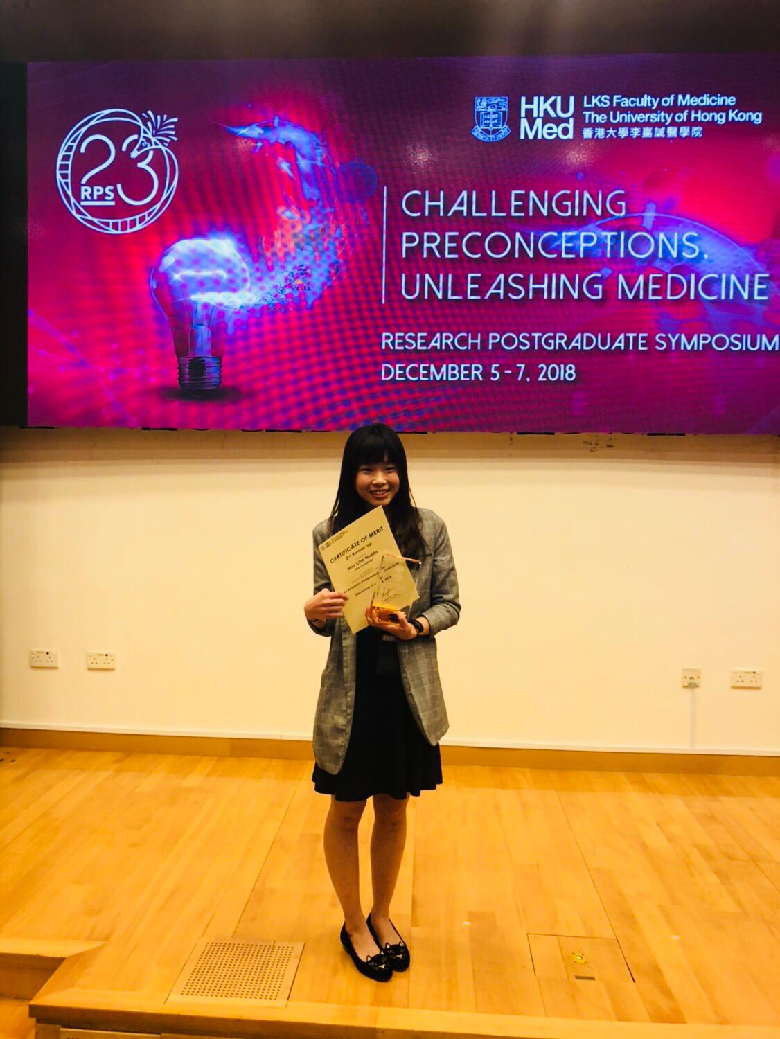 23rd RPG Symposium – Congrats to Noel! December 7, 2018December 7, 2018sma lab Warm congratulations to our PhD student Noelia Che on being awarded one of three Best Oral Presentation Awards at this year’s HKU Faculty of Medicine’s Research Postgraduate Symposium held from 5-7 December 2018. We are proud of you! Job well done!