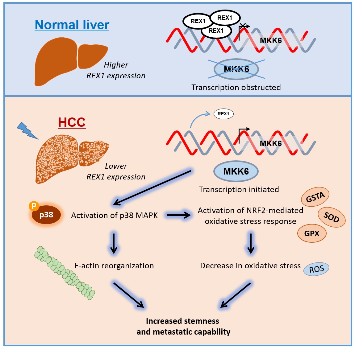 Read all about Steve’s REX1 story in the upcoming issue of Hepatology. In brief, the work describes a critical repressive function of REX1 in maintenance of HCC cells by regulating MKK6 binding and p38 MAPK signaling. REX1 deficiency induced enhancement of p38 MAPK signaling, leading to F-actin reorganization and activation of NRF2-mediated oxidative stress response, which collectively contributed to enhanced stemness and metastatic capabilites of HCC cells.
