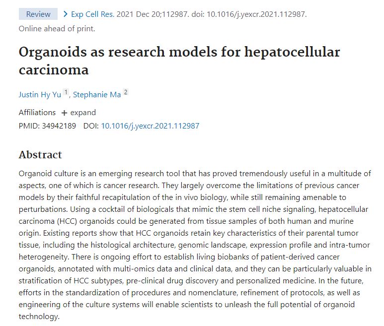 Happy to share our new review paper on ‘Organoids as research models for hepatocellular carcinoma’ published in Experimental Cell Research. A great way to wrap up 2021. Congrats to Justin, our MRes(Med) student, on his very first paper!