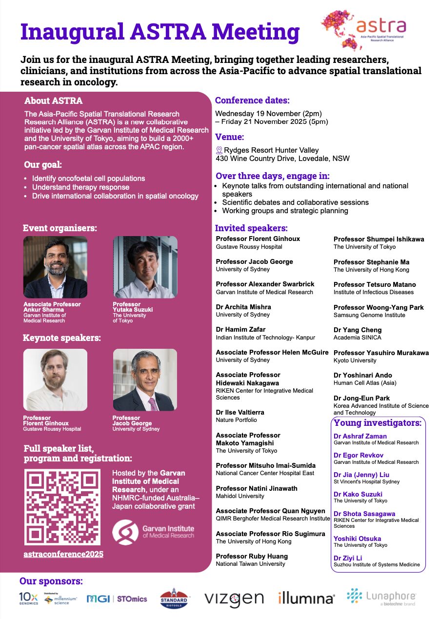 19-21 Nov 2025 – The inaugural Asian Pacific Spatial Translational Research Alliance (ASTRA) 2025 took place at Rydges Resort, Hunter Valley, New South Wales, Australia. Thank you, Ankur, for the invitation to speak at the meeting and for joining the alliance. I look forward to building our collaboration across the APAC region.