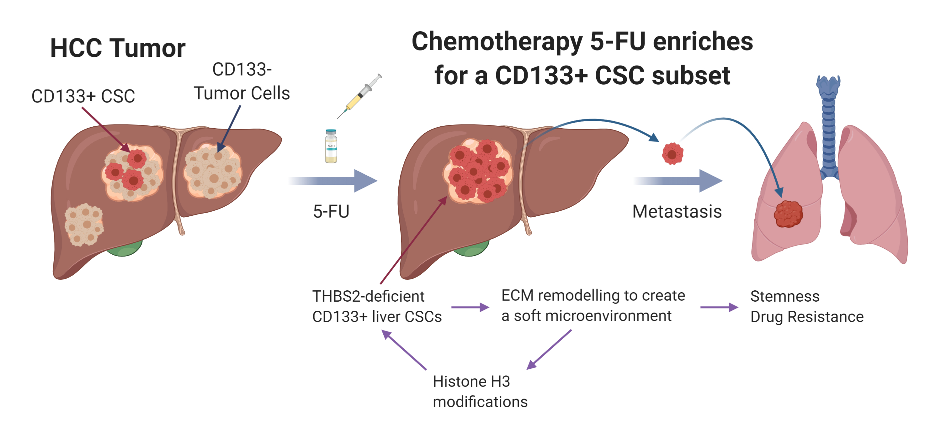 Findings of this study show that extracellular matrix remodeling by chemotherapy 5-FU enriched THBS2-deficient CD133 cancer stem cells can provide a route of escape that leads to HCC metastasis. In brief, 5-FU enriches for CD133 expressing cells with deficient THBS2 expression. THBS2, which is a known extracellular matrix (ECM)-modifying protein, has the ability to alter MMP2/MMP9 activity and thus collagen and matrix stiffness, which leads to altered cancer and stemness properties. This local soft microenvironment then induces mechano-epigenetic changes to enhance CD133 expression and suppress THBS2 expression through histone H3 modifications at their respective promoter regions, facilitating a positive feedback loop that supports the clonogenic expansion of a subpopulation of HCC cells with high CD133 expression and low THBS2 expression.